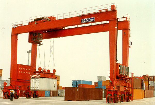 運到堆場或后方后,由集裝箱龍門起重機堆碼起來或直接裝車運走,可加快集裝箱運載橋或其他起重機的周轉??啥逊鸥?~4層、寬6排的集裝箱的堆場,一般用輪胎式,也有用有軌式的。集裝箱龍門起重機與集裝箱跨車相比,它的跨度和門架兩側的高度都較大。為適應港口碼頭的運輸需要,這種起重機的工作級別較高。起升速度為8~10米/分;跨度根據需要跨越的集裝箱排數來決定,*大為60米左右相應于20英尺、30英尺、40英尺長集裝箱的起重量分別約為20噸、25噸和30噸。